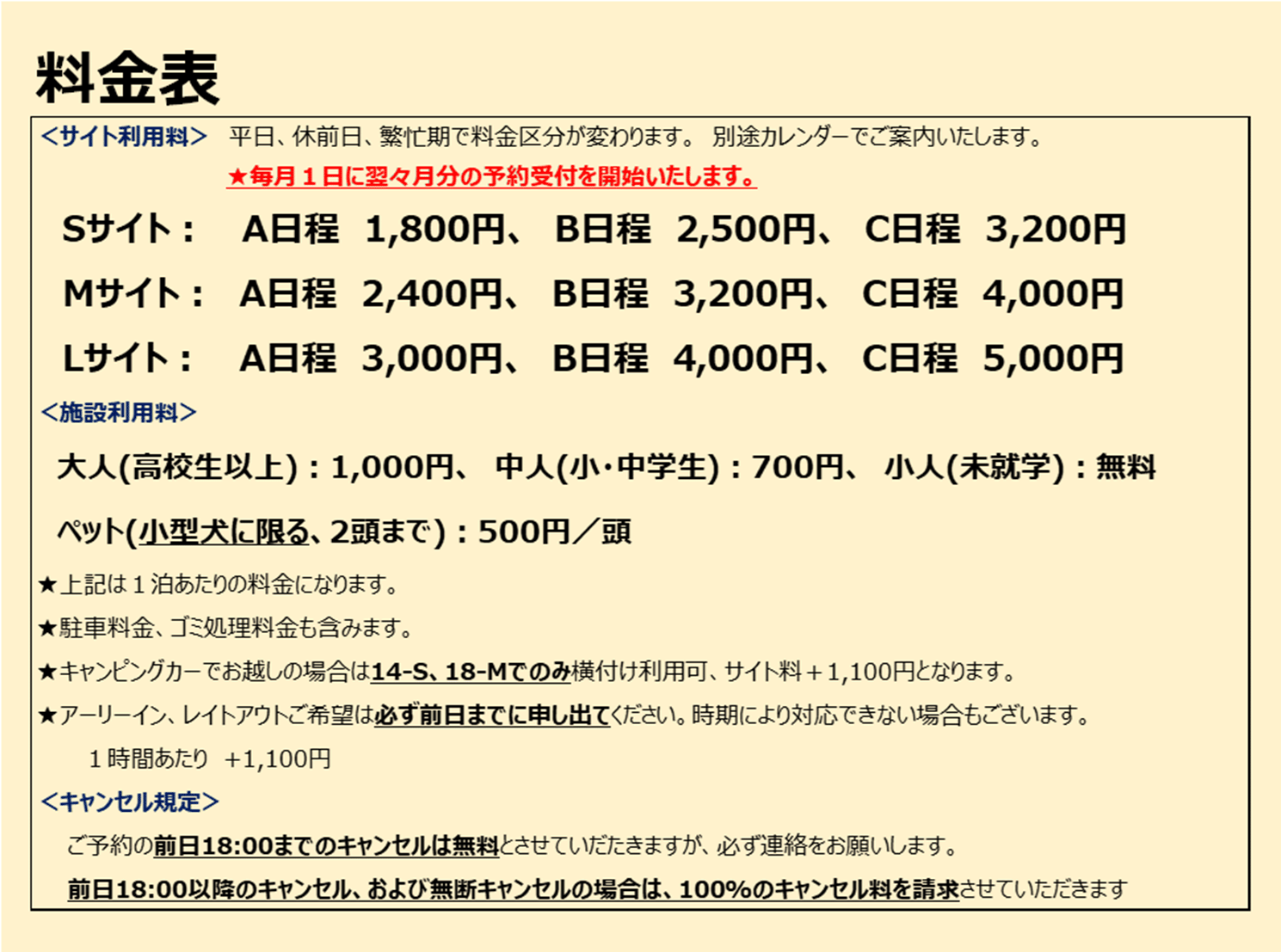【管理人】駐在 【ペット】条件有りでOK(条件:躾のできた小型犬のみ、1サイト2頭まで) 【ゴミ】キャンプ場が回収(無料) ゴミの分別:有 【禁止事項】